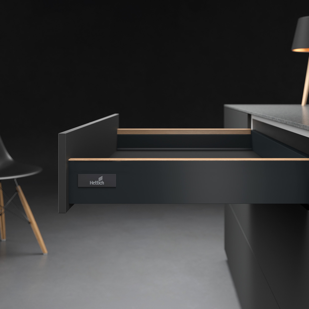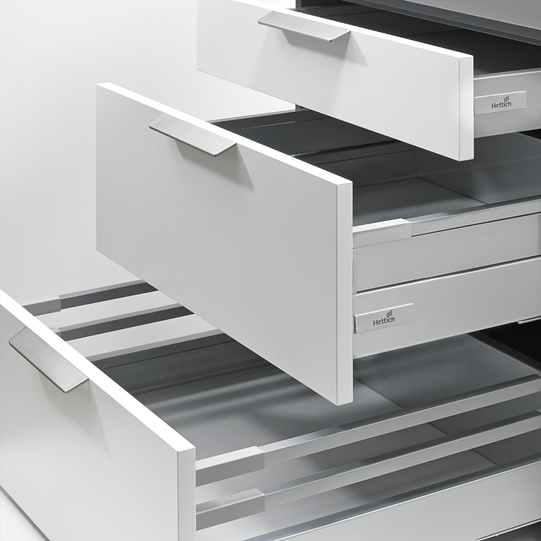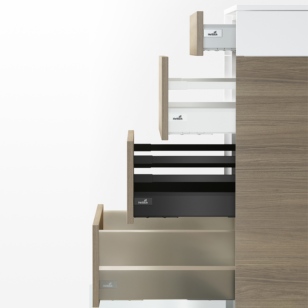 Hettich propune 5 tipuri de mecanisme pentru sertare: AvanTech You, ArciTech, InnoTech Atira, InnoTech și MultiTech. Toate sertarele vin în diferite mărimi și nuanțe de culori. Completarea sertarelor la fel este diferită, de la railinguri pe margini pînă la mecansime Push to Open integrate în glisiere. La fel Hettich oferă glisierele tip Quadro cu deschidere parțială sau totală, care mai sunt dotate cu sisteme „silent glide” și „self close”.