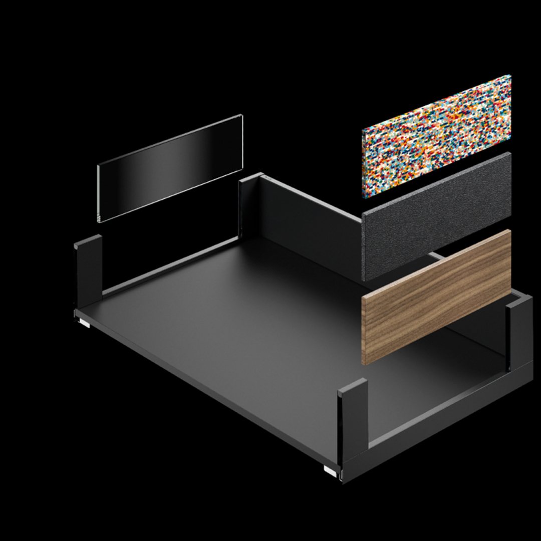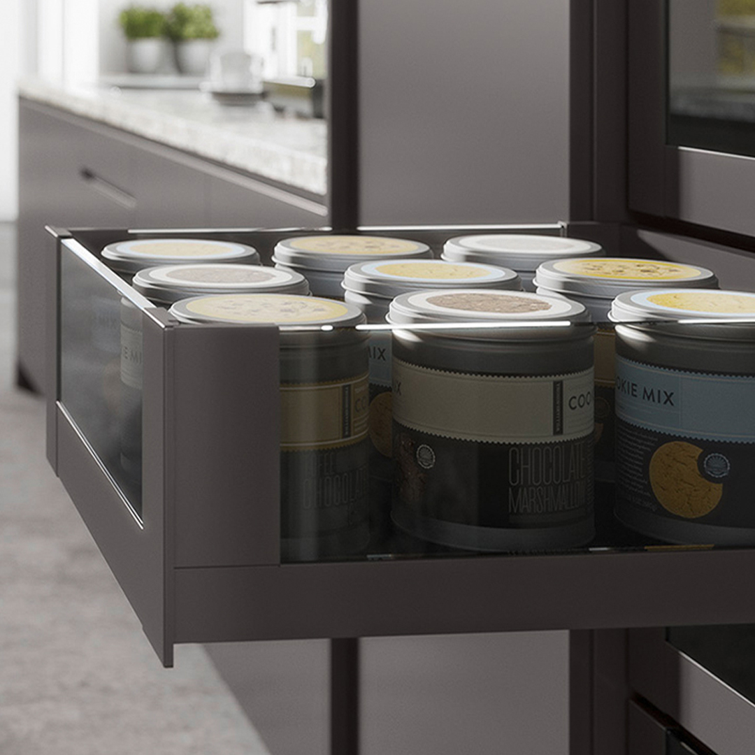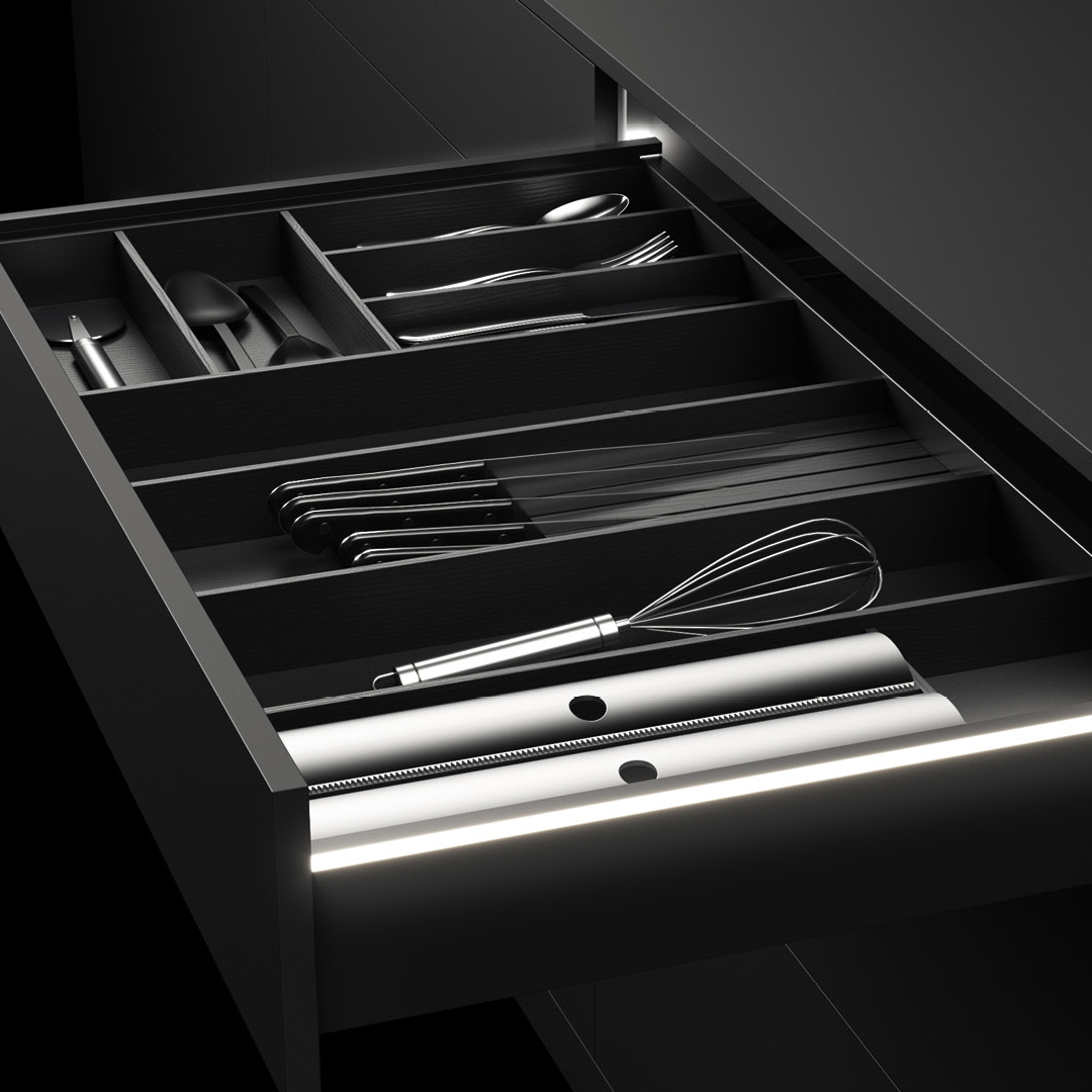 Sertarele din categoria ArciTech sunt și ele dotate cu laterale personalizabile, cu texturi de lemn, sticlă sau metal cromat. În construția acestor sertare intră și ralingurile, un fel de balustradă marginală în aceiași nuanță de culoare ca și lateralele metalice ale sertarelor.