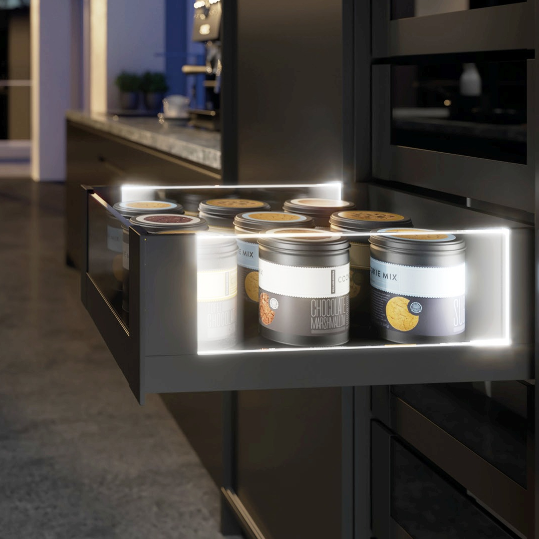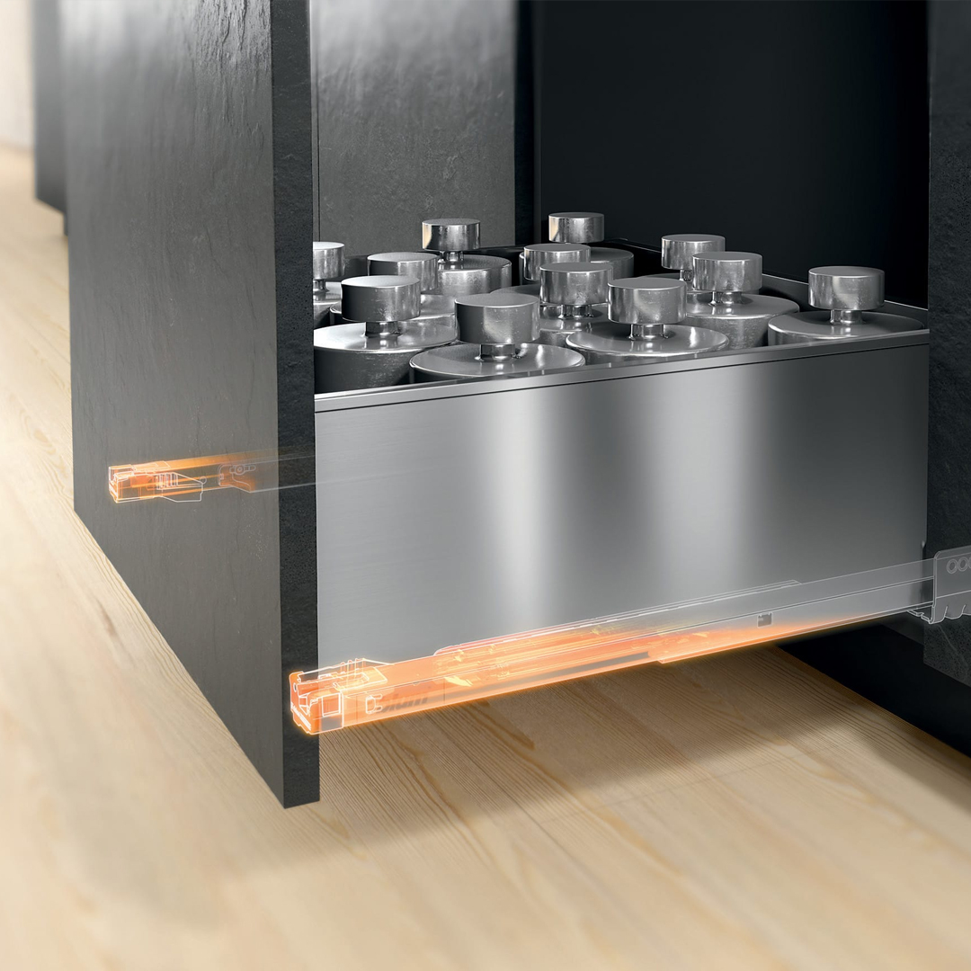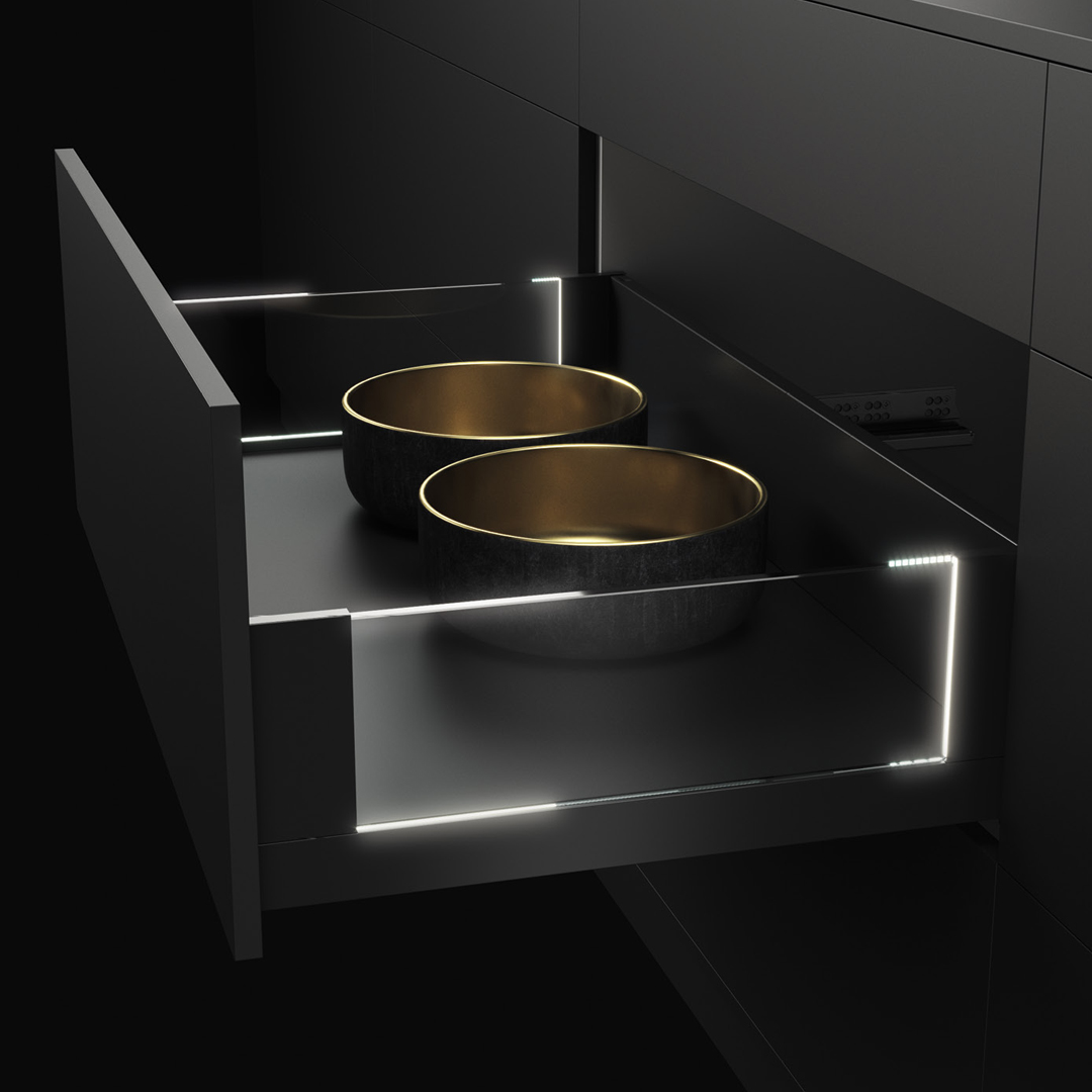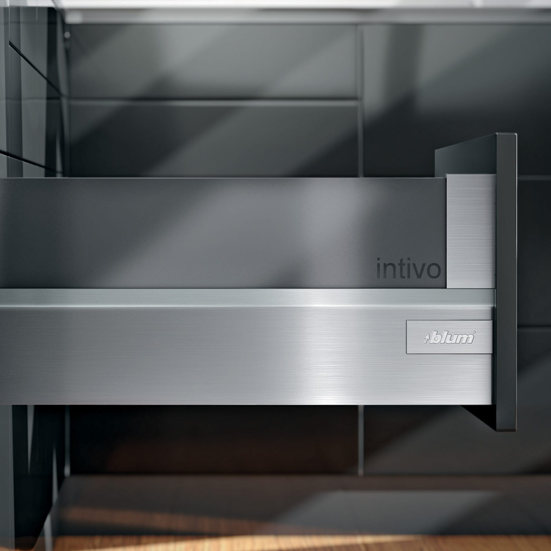 Sertarele Intivo sunt categoria de Lux a sertarelor Blum, ele fiind executate într-o manieră fină și luxoasă. Lateralele fiind metalice cu aplicații de sticlă. La fel ca și AvanTech You de la Hettich, Intivo oferă iliuminare Led a sertarelor.