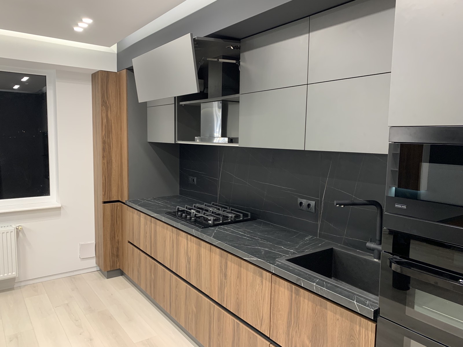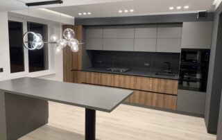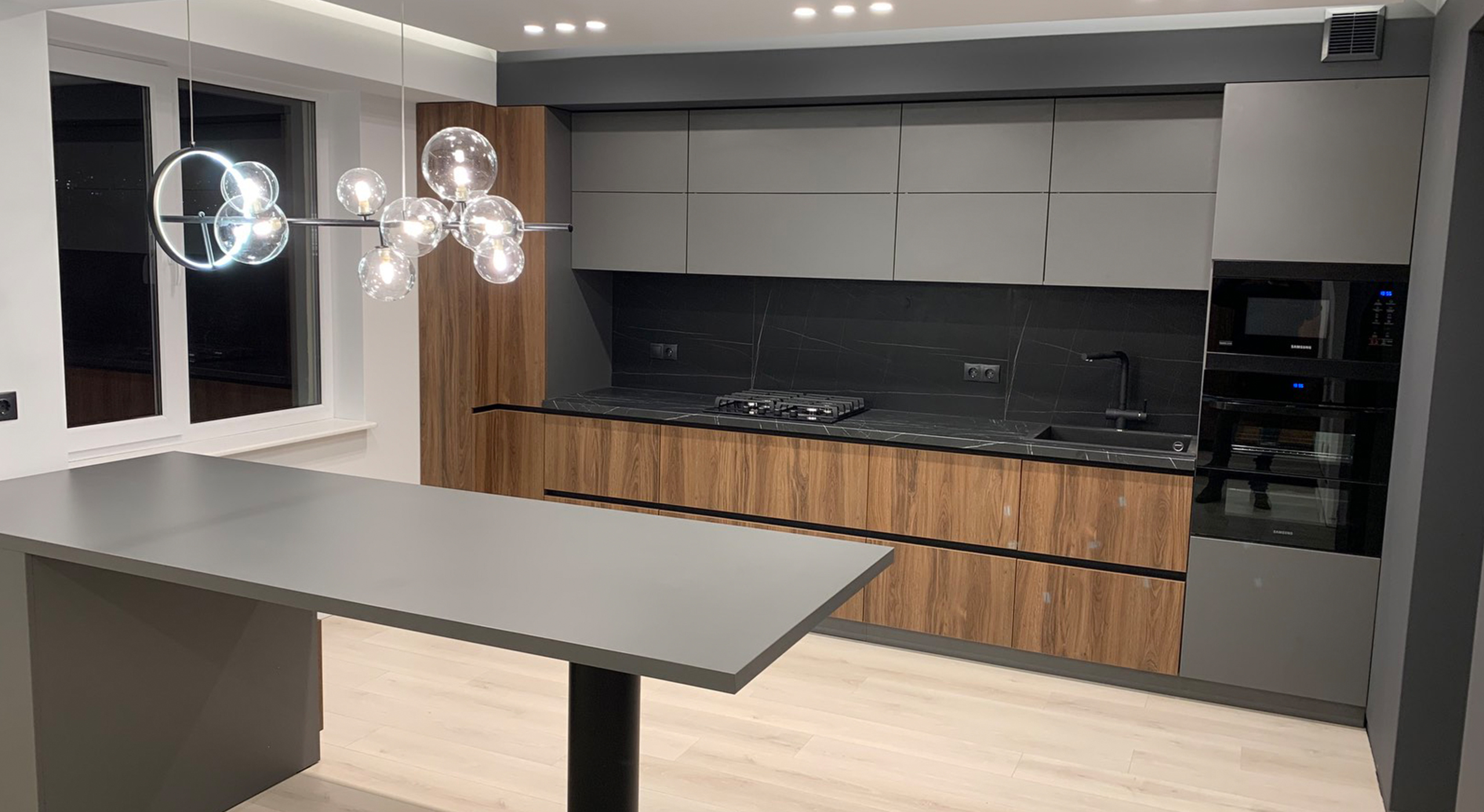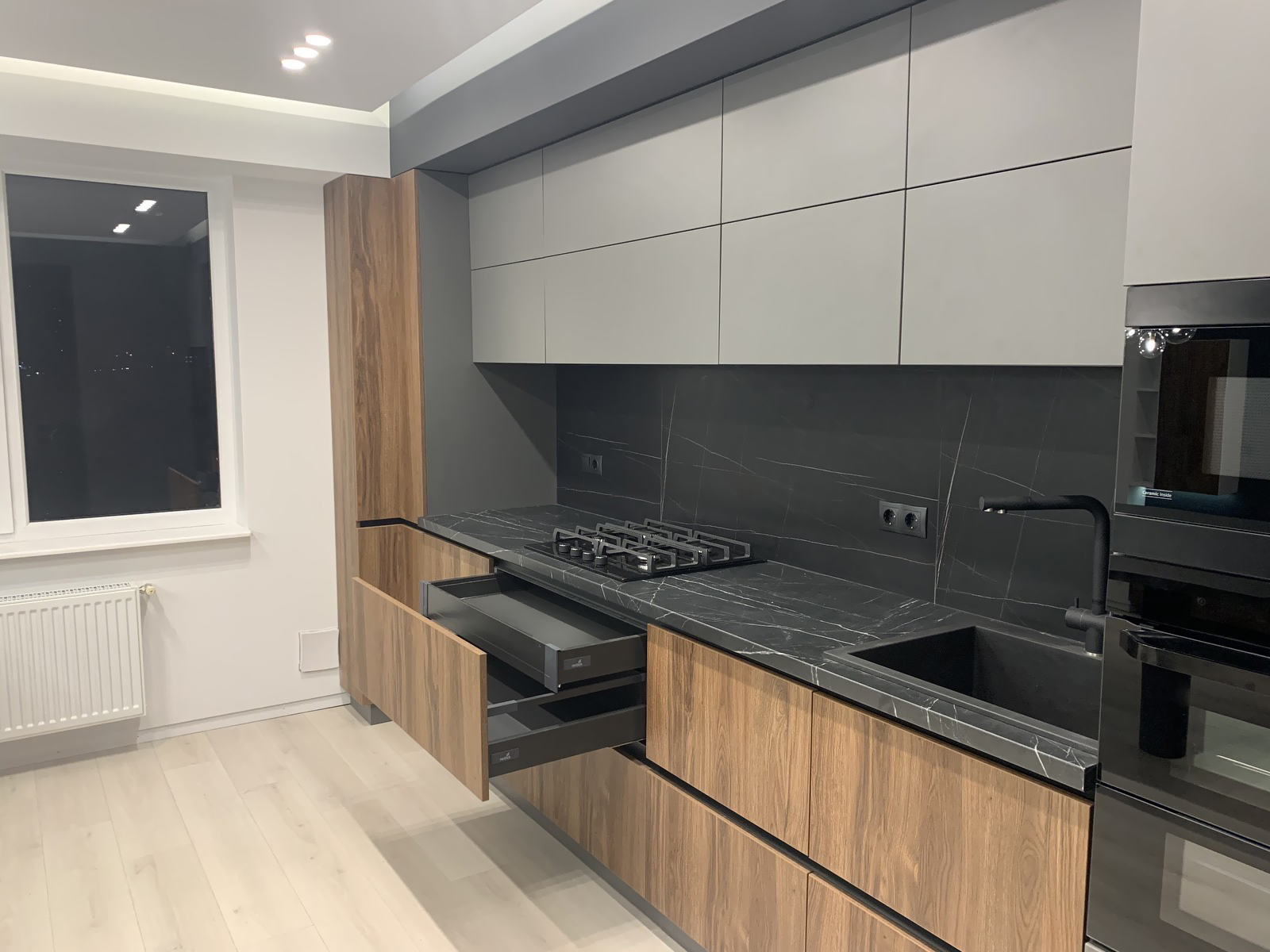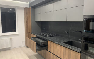 Proiectul include mobilă de bucătărie cu insulă, living, 2 băi, antreu, garderoba și dormitorul. Mobilier în stil modern minimalist, cu nuanțe de gri și textură de stejar care se combină perfect.