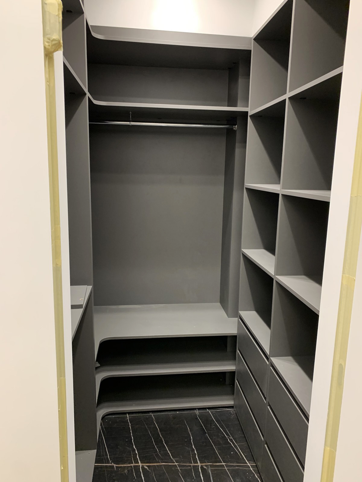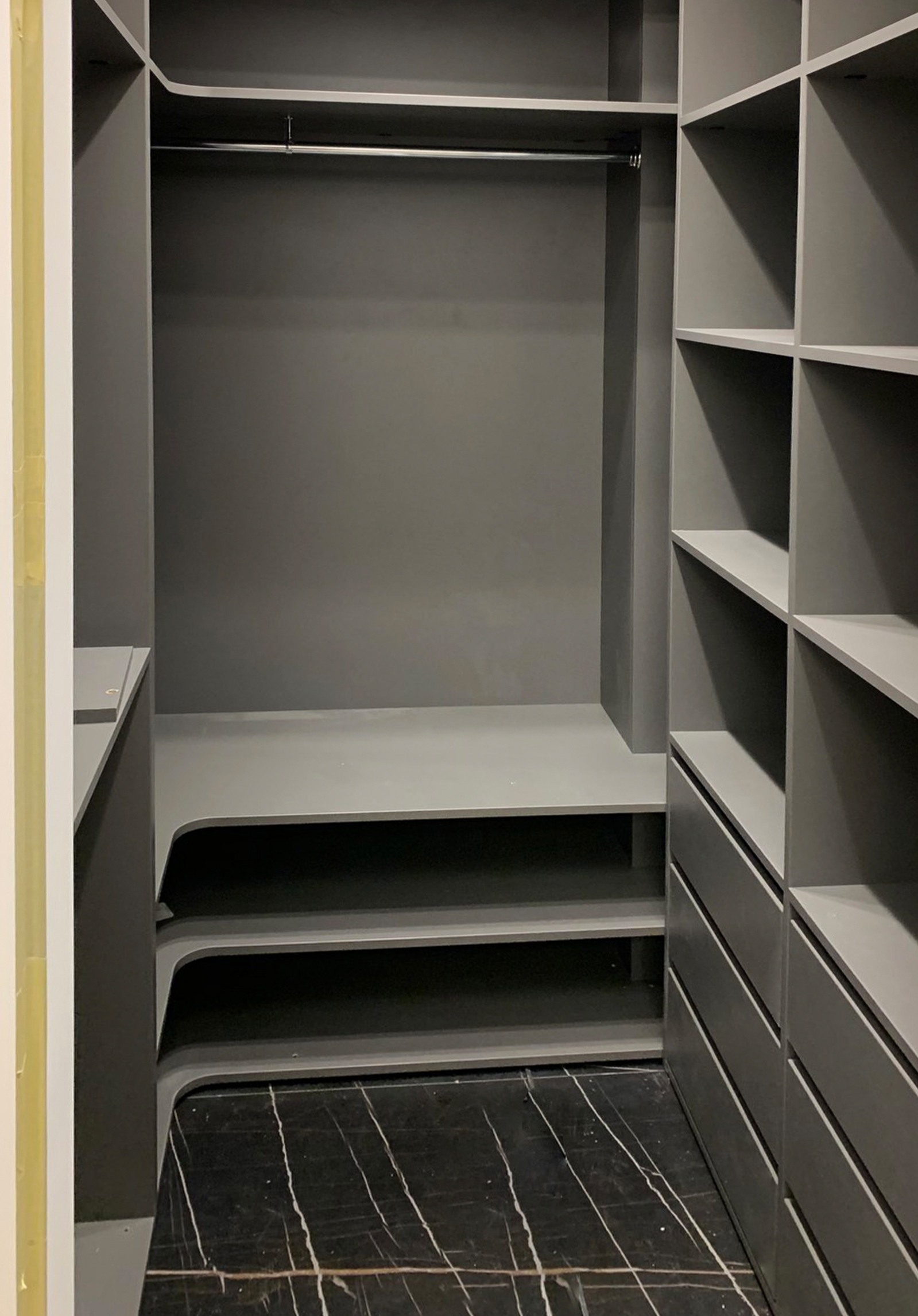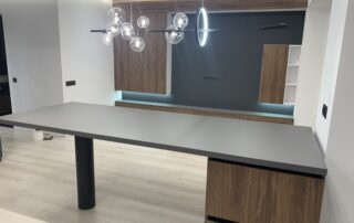 Materialul de bază utilizat a fost Pal Melaminat Egger – gri onix, stejar Charleston, fronturi MDF Venni, rafturi sticlă, blat Egger, blat marmură.