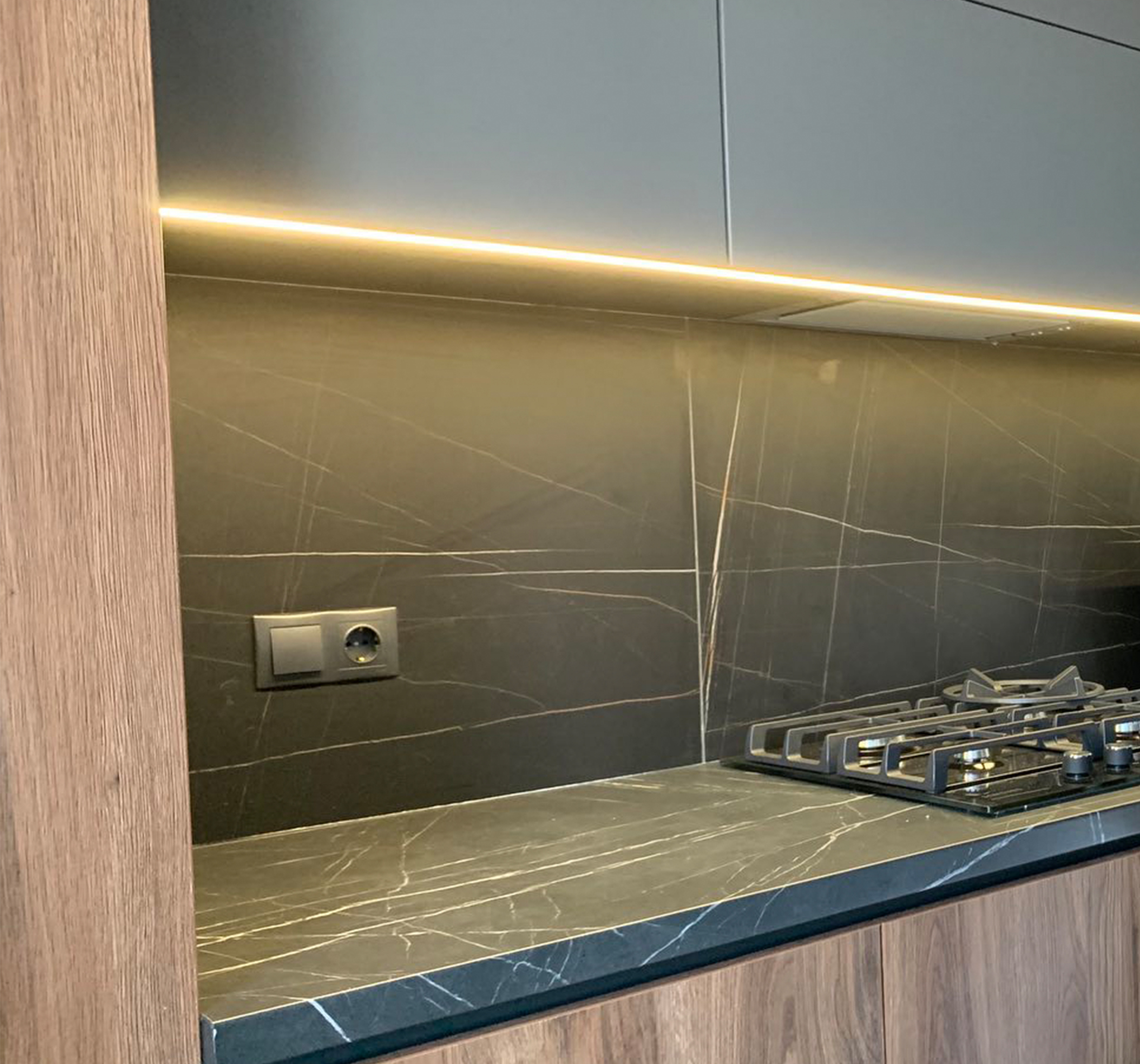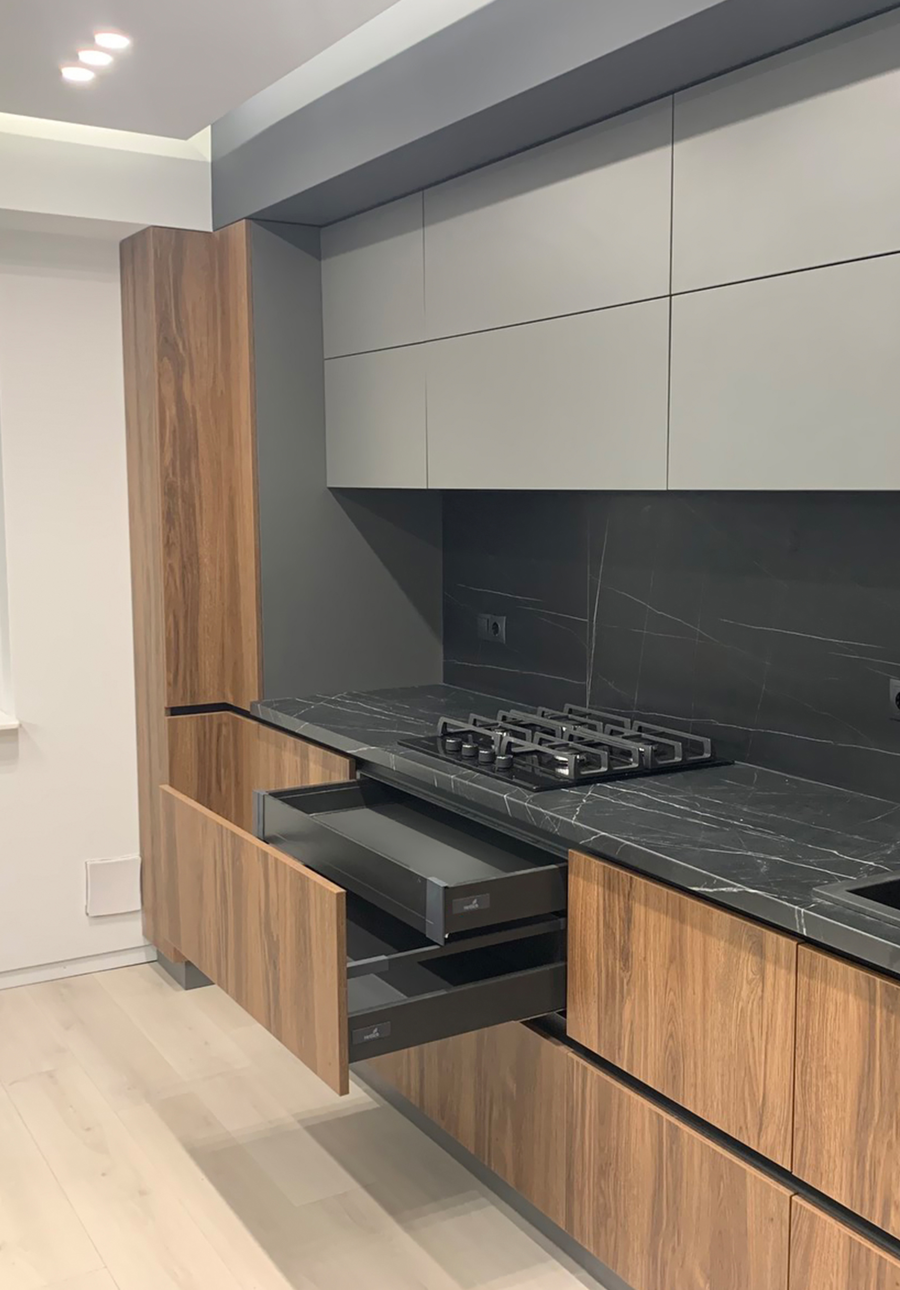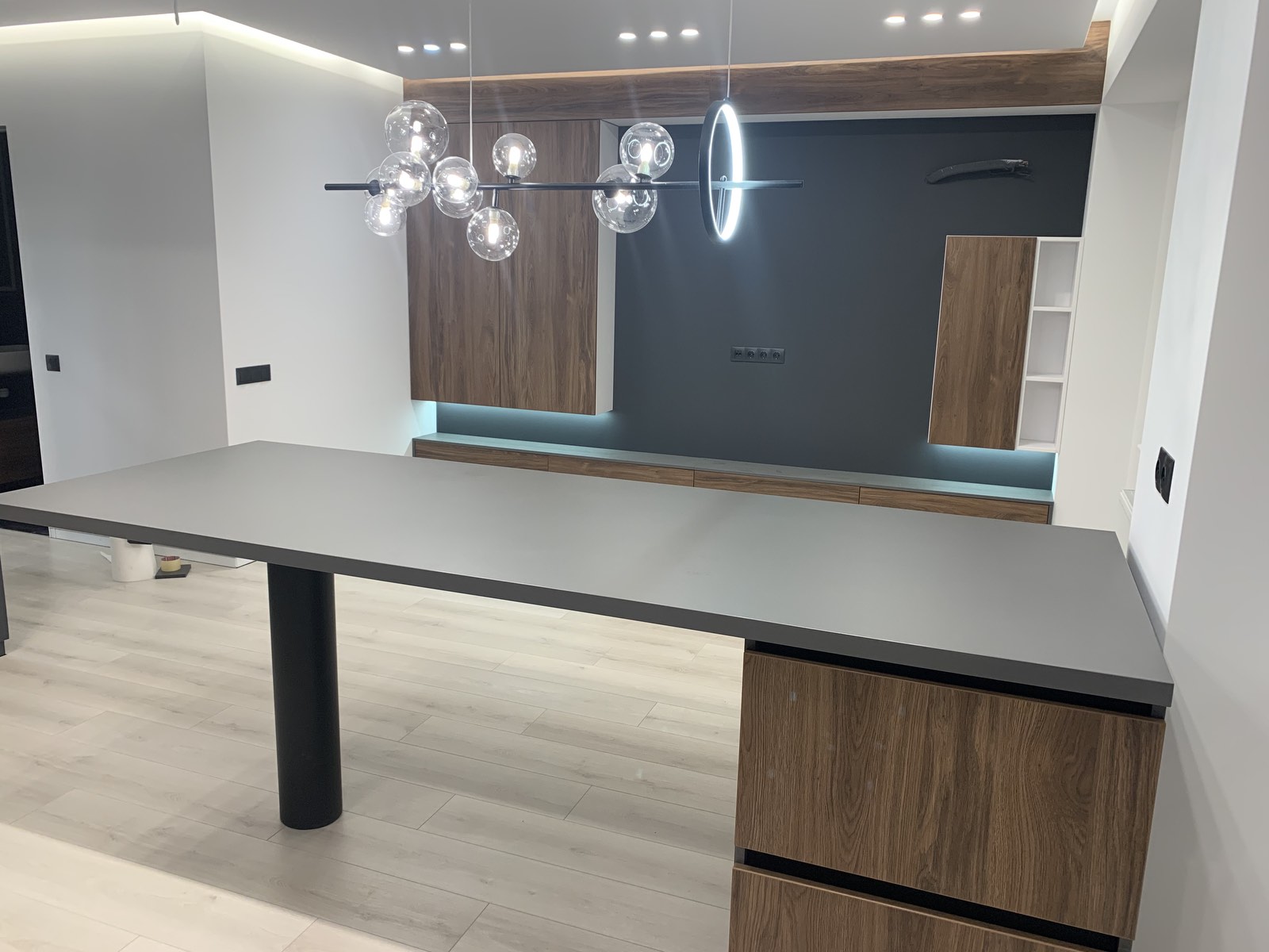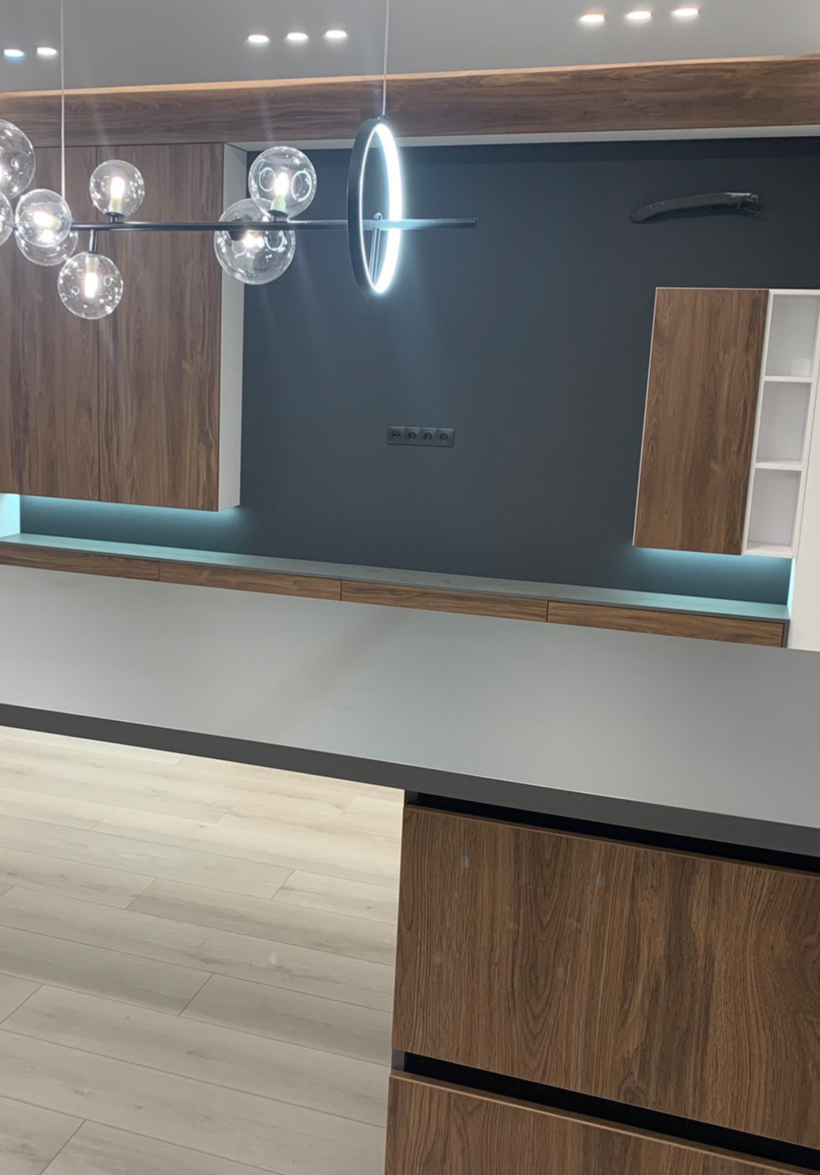 La elaborarea proiectului am ales feronerie Hettich și Blum, iluminare led încorporat în profil.