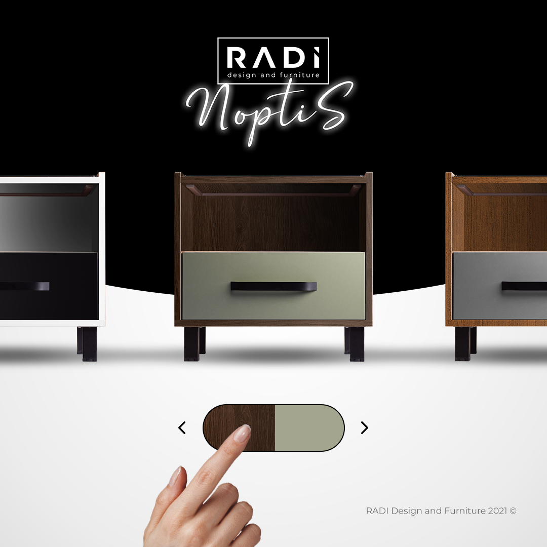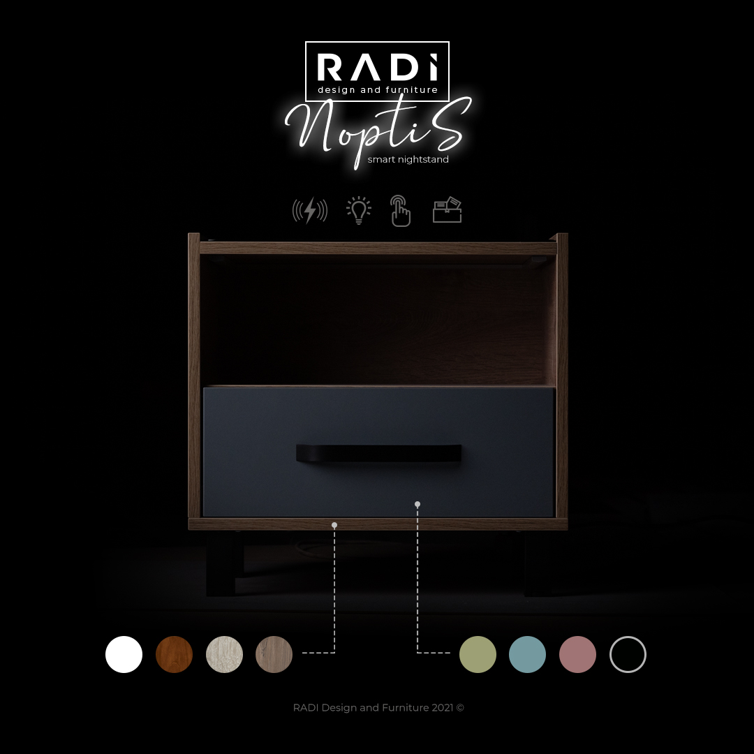 Luând în considerație soluțiile cormatice ale dormitorului fiecărui client, Noptis poate fi adaptat, oferindu-se o gama cromatica largă care va fi pusă la dispoziția clientului. Culorile pot fi modificate atât pentru carcasă cât și pentru frontul sertarului.