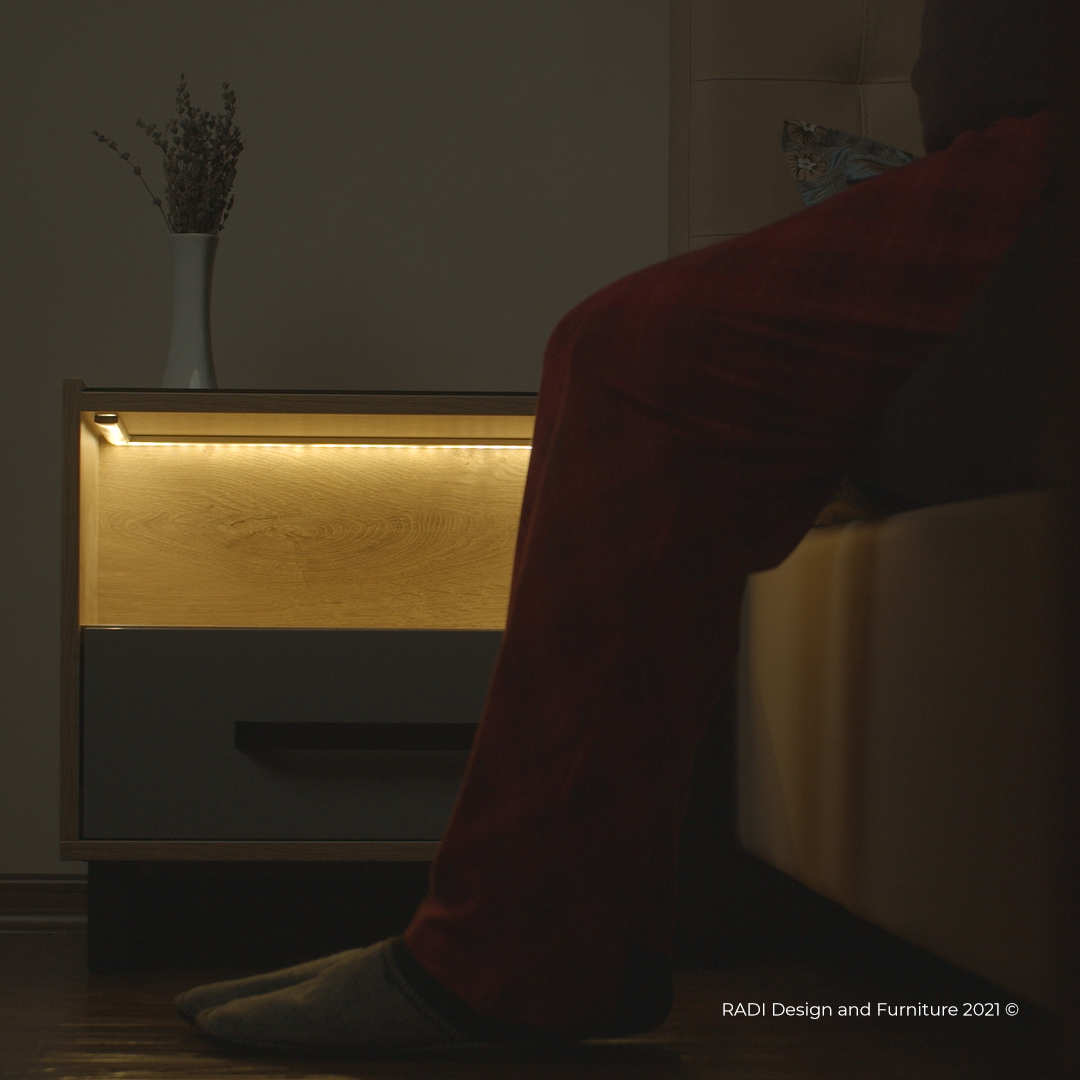 Senzorul de lumină este tactil, și ușor reacționează la atingere, este necesar doar să puneți un deget sau toată palma în zona sonzorului și acesta va porni sau va stinge lumina. Noptis este suficient de încăpător, având 2 zone de depozitare a obiectelor, zona superioară și sertarul.