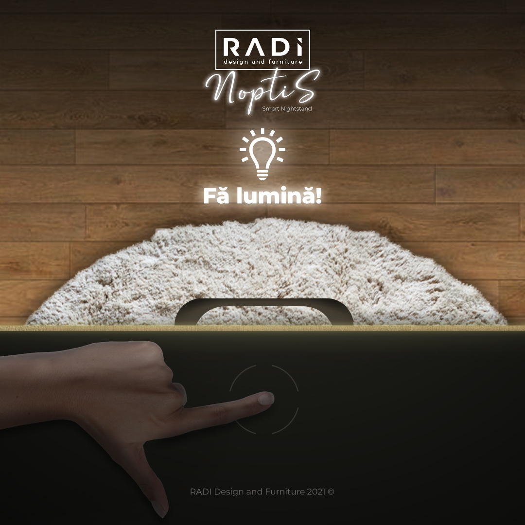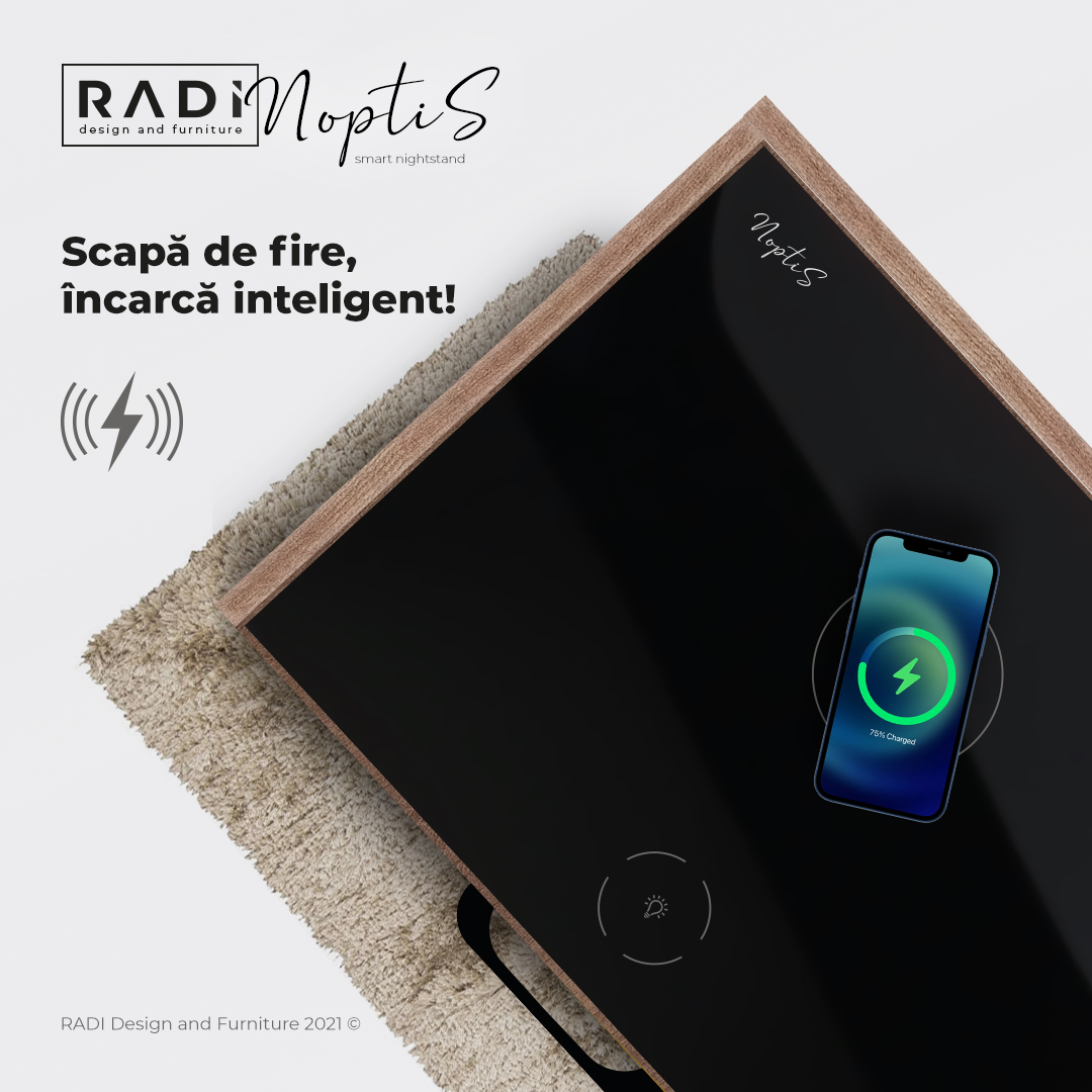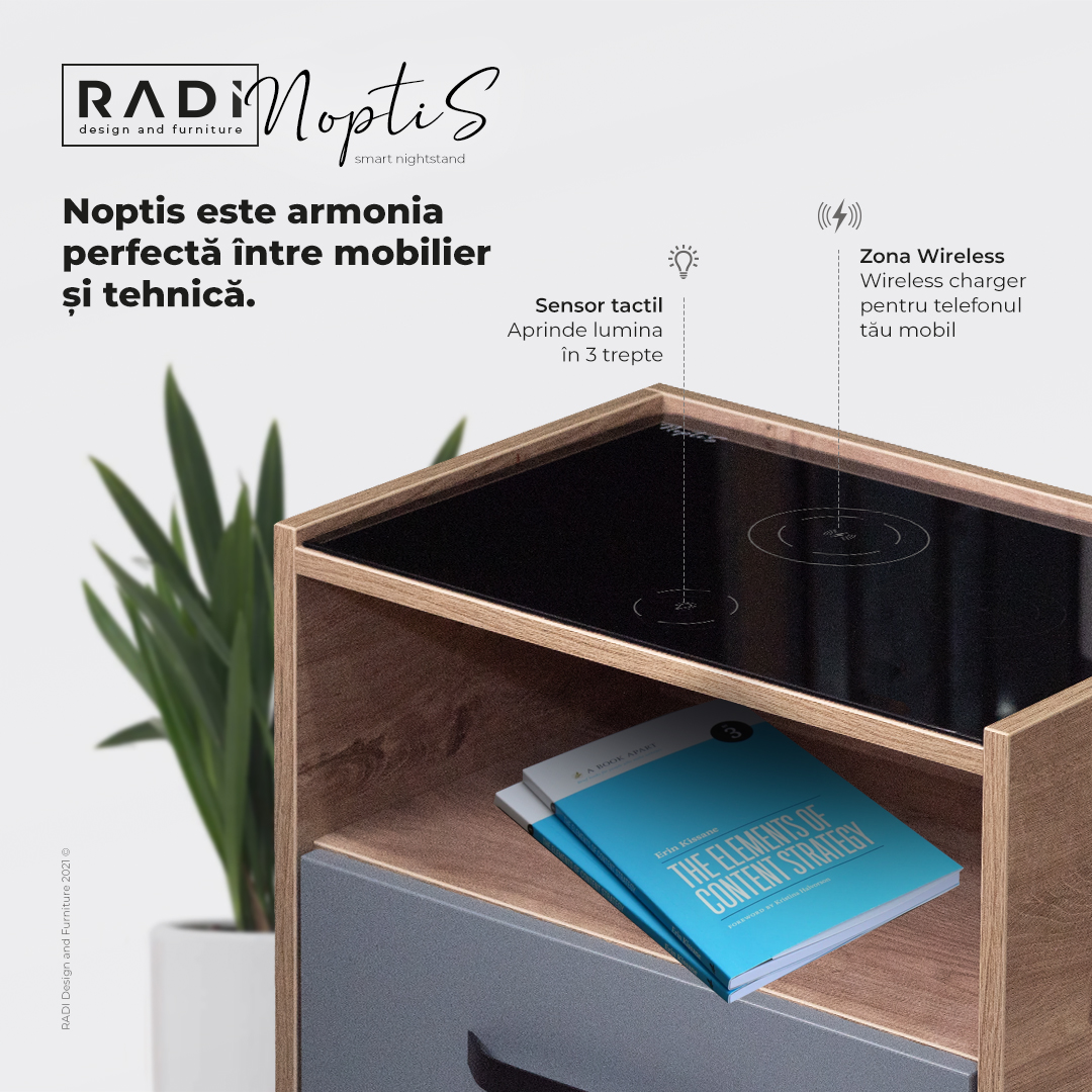 Combinația între lemn și sticlă redă un caracter rafinat și delicat noptierei, iar funcțiile pe care le are vă va ușura modul de viață. Fie că vrei să îți pui telefonul la incărcat în siguranță peste noapte, fie că vrei să pornești lumina cand mergi la baie prin întuneric, fie că pur și simplu vrei să depozitezi o carte sau o revistă, Noptis este noptiera care oferă aceste soluții.