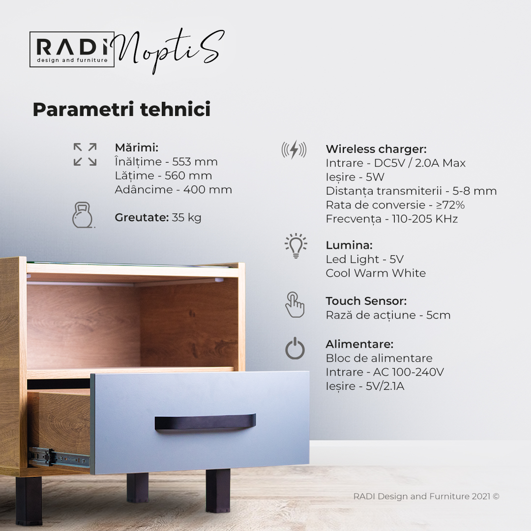 Noptis este armonia perfectă între mobilier și tehnică. Este o noptieră multifuncțională, elaborată într-un stil modern-minimalist, care este ușor de asamblat chiar și pentru un copil.